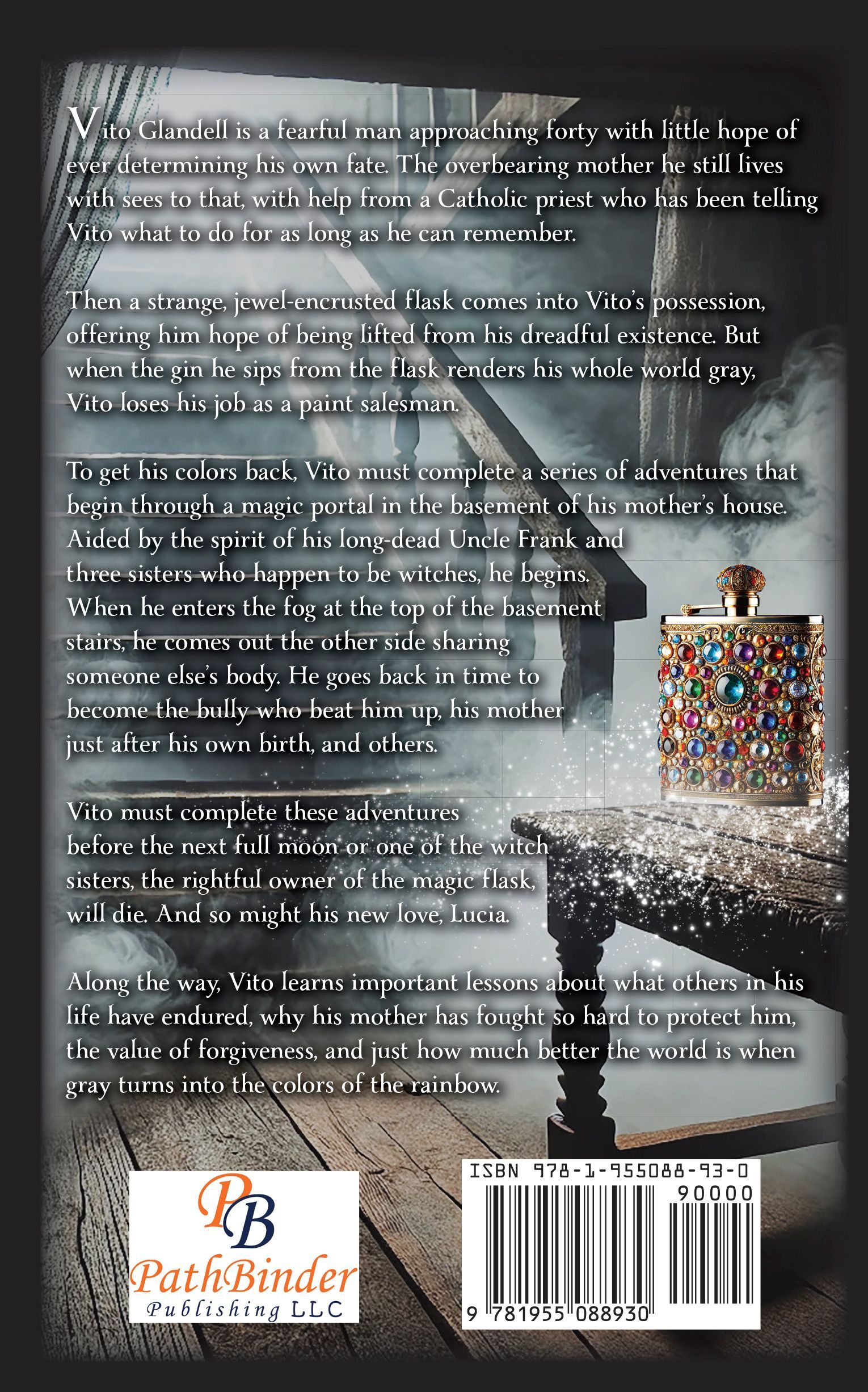 Then a strange, jewel-encrusted flask comes into Vito’s possession, offering him hope of being lifted from his dreadful existence. But when the gin he sips from the flask renders his whole world gray, Vito loses his job as a paint salesman. To get his colors back, Vito must complete a series of adventures that begin through a magic portal in the basement of his mother’s house. Aided by the spirit of his long-dead Uncle Frank and three sisters witches, he begins. Along the way, Vito learns important lessons about what others in his life have endured, why his mother has fought so hard to protect him, the value of forgiveness, and just how much better the world is when gray turns into the colors of the rainbow.